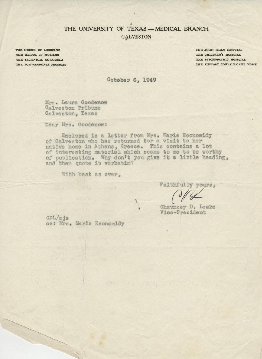 A typed letter on aged paper with text printed in black ink. On both the right and left hand corners are lists of medical schools: (L): The school of Medicine, The School of Nursing, The Technical Curricula, and The Post-Graduate Program. (R): The John Sealy Hospital, The Children's Hospital, The Hospital, and The Stewart Convalescent Home. In the center. Located in the top center is the text, "The University of Texas-Medical Branch Galveston." Underneith the letter head is the date, "October 6, 1949." The letter reads, "Mrs. Laura Goodenow, Galveston Tribune, Galveston, Texas. Dear Mrs. Goodenow: Enclosed is a letter from Mrs. Marie Economidy of Galveston who has returned for a visit to her native home in Athens, Greece. This contains a lot of interesting material which seems to me to ne worthy of publication. Why don't you give it a little headings, and then quote it verbatim? With best as ever, Faithfully yours, (Signed) Chauncey D. Leake, Vice-President." To the far left of the signature are the text, "CDL/mjs" and "cc: Mrs. Marie Economidy."