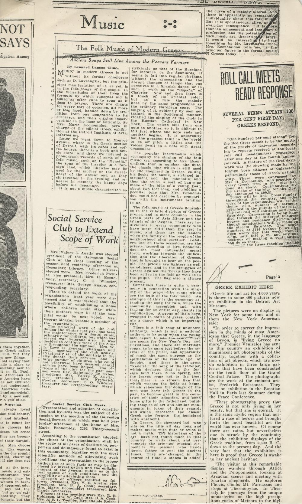 A black and white photocopy of five newspaper articles collage together on a page. To the left is a cut-off images of two photographs and a article. On the right-hand side are four separate newspaper clippings: "Folk Music of Modern Greece," “Social Service Club to Extend Scope of Work,” “Social Service Clubs Meets,” "Roll Call Meets Ready Response", and “Greek Exhibition Here."