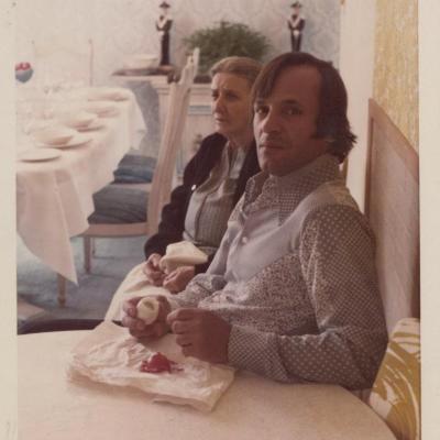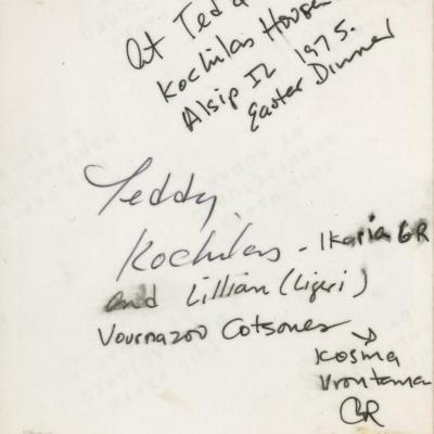 A photograph of two people seated in a dining room-like setting at a table with a white tablecloth. The individual in the foreground is wearing a gray and white patterned shirt. They appear to be peeling an egg in their left hand with the ruminates of the shells on a napkin underneath. Seated behind the individual is another figure: they are dressed in a black sweater and patterned blouse and can be seen holding a cloth napkin. On the back of the photograph is writing in black ink, the text reads, "1973" (central left corner), "DAW" (central right corner), "At Ted and Maria Kochilas House in Alsip, Il, 1975. Easter Dinner" (near the center). "Teddy Kochilas-Ikaria Gr and Lillian (illegible), Vourna Cotsones, a draw-in arrow sign, Kosma Vrontama GR" (near the bottom).