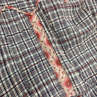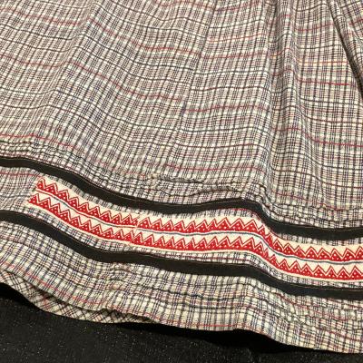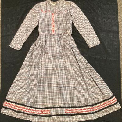 Small dress with long sleeves and a plaid pattern of off white, red, and black. There is a small ruffled trim around the collar, a detailed fitted bodice, gathered waist, with small pleats, full skirt, and a trim around the hemline.