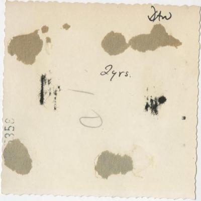 A black and white photograph of eight individuals, five adults and three children, posing for the camera in a dinning room setting. In the foreground, left from right, is a child wearing a dress with a white collar and a printed design chest. To their left is a young child seated in a high chair with a cake on the platter portion of the chair. In the center is another child, they are dressed in a button shirt and have they body turn the adult standing behind them. To the far right is a seated individual, they are dressed in a blouse with a high collar and looking directly at the camera. In the back, reading from left to right are four standing figures. To the left is a figure dressed in a suit, their are smiling, and leaning against the person to their right. To the right of the leaning individual is a person with their left hand holding the head of the left-side figure. They are dressed in a button blouse and sweater. In the center is an individual dressed in a long-sleeved turtle neck with a pearl necklace and matching earrings. To the far right is another figure, they are their arm warped around the center figure and is wearing a patterned sweater. On the back of the photograph is a note which reads, "DAW 2 yrs."