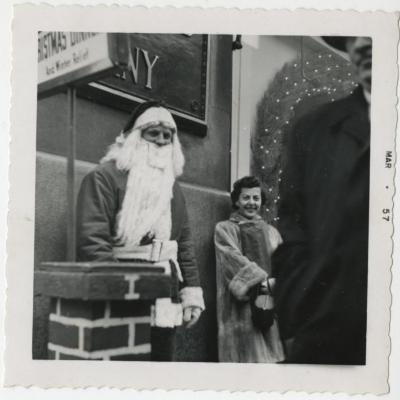 A black and white photograph showcasing two individuals standing outside of a bricked building. To the left is an individual dressed in a Santa Claus costume with two signs, one above with the letters "NY" and the other sign to the left, reading "Christmas Dinner and for Winter Relief" flaking them. To the right is another individual, they are dressed in a fur coat, with a large wreath above their heads, and is leaning against the building. In the foreground, far right-side, is the figure of a passing individual. On the back of the photograph is a semi-legible message reading, "Diane Alexander White, 1957, Georgia, Costones Alexender, 1955."