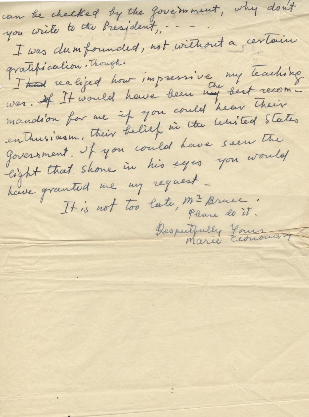 A handwritten, four paged letter on aged paper with black ink. The letter is broken into three paragraphs, is written in English, and has minor editorial markings throughout the page. The letter is written by Mrs. Marie Economidy and is addressed to Edward Bruce in Washington D.C. The letter is an inquiry letter regarding Mrs. Economidy's rejection from The Aid to Greece Program.