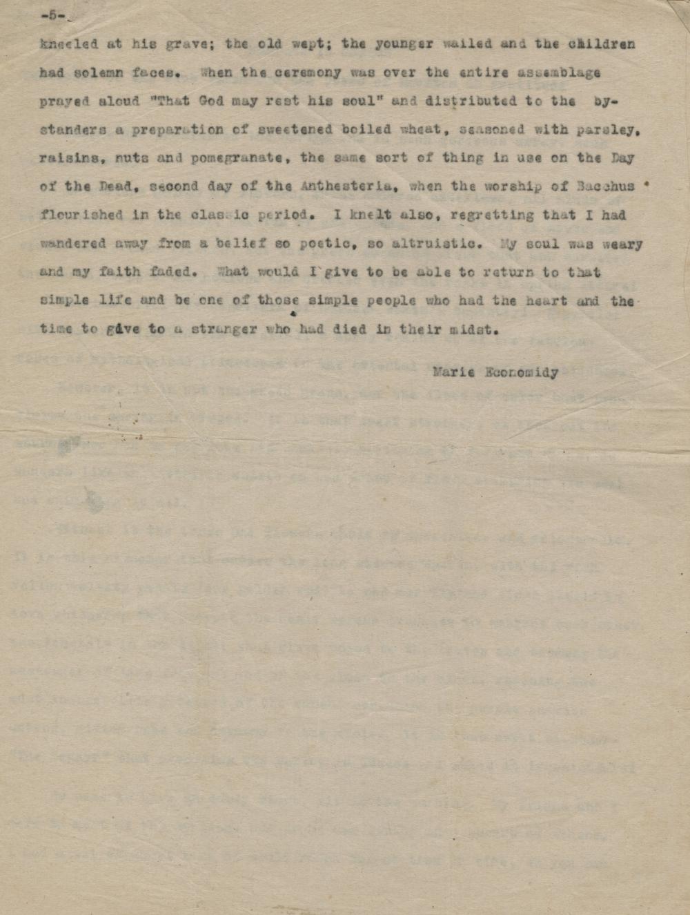 A typed, five-page document, possibly an essay/lecture that has been broken down into five paragraphs. In the top right corner is the page number, "five."