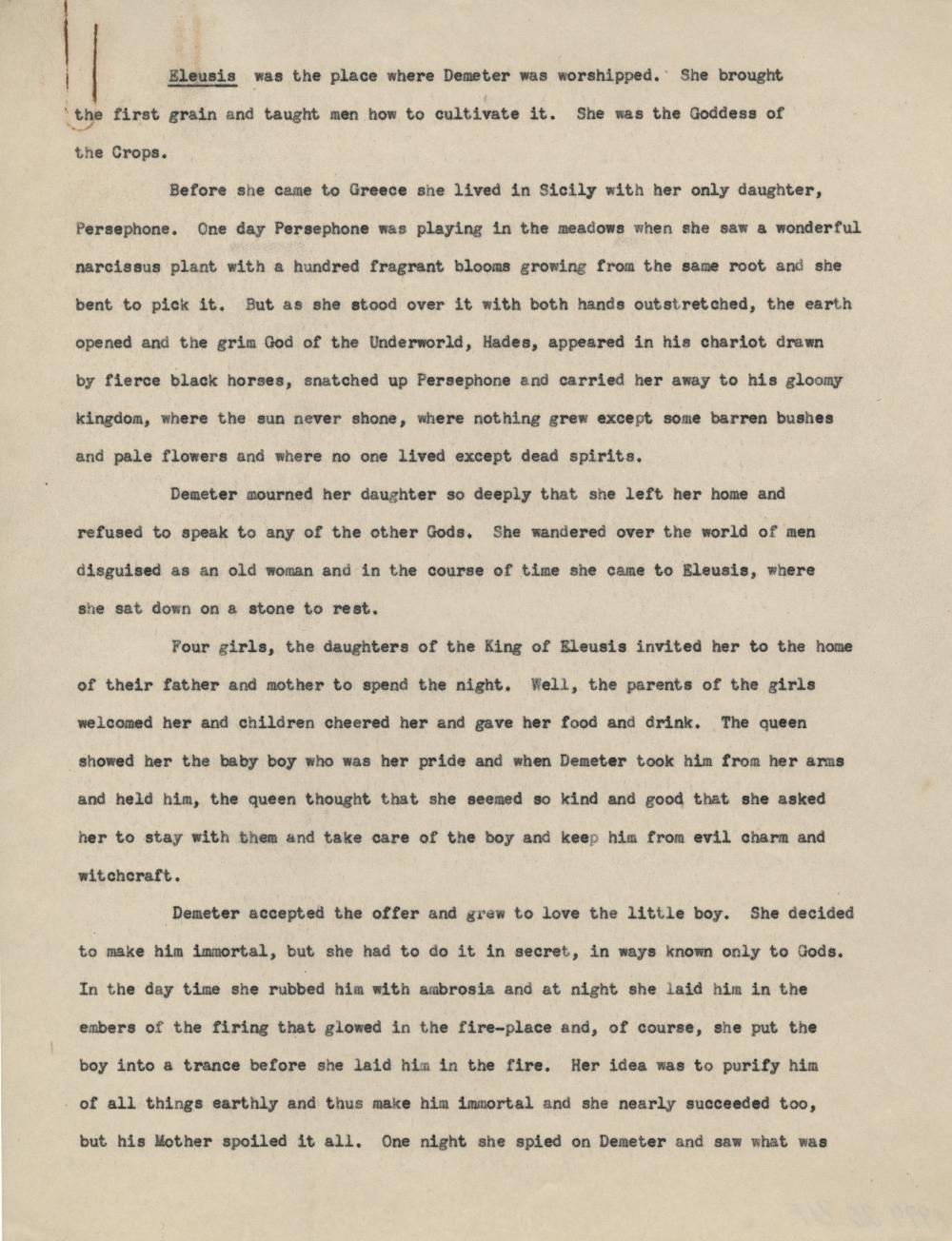 A typed, eight-page document, possibly an essay or lecture, has been divided into five paragraphs. The document is written in English and typed with black ink on paper. Near the top of the document, in the first paragraph, there is an underlined word – Eleusis. There is discoloration in the top left corner from a paper clip.