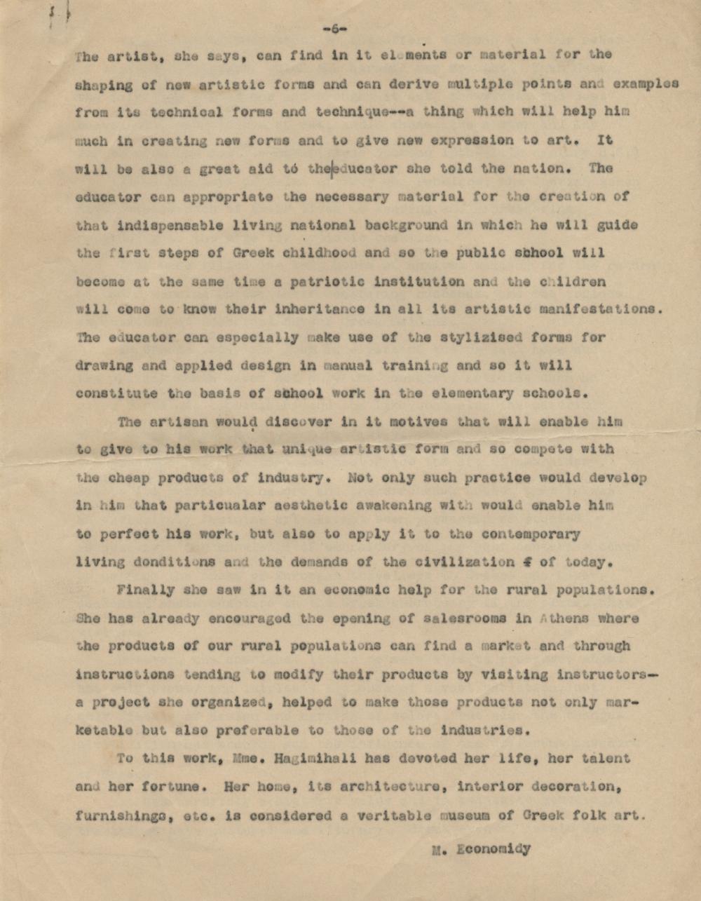 A typed, six-page document, possibly an essay or lecture, has been divided into four paragraphs. The document is written in English and typed with black ink on paper. In the top corner is a text which reads, "-6-." In the top left corner is an impression of a paper clip. At the end of the document a line of text, which reads, "Maria Economidy."