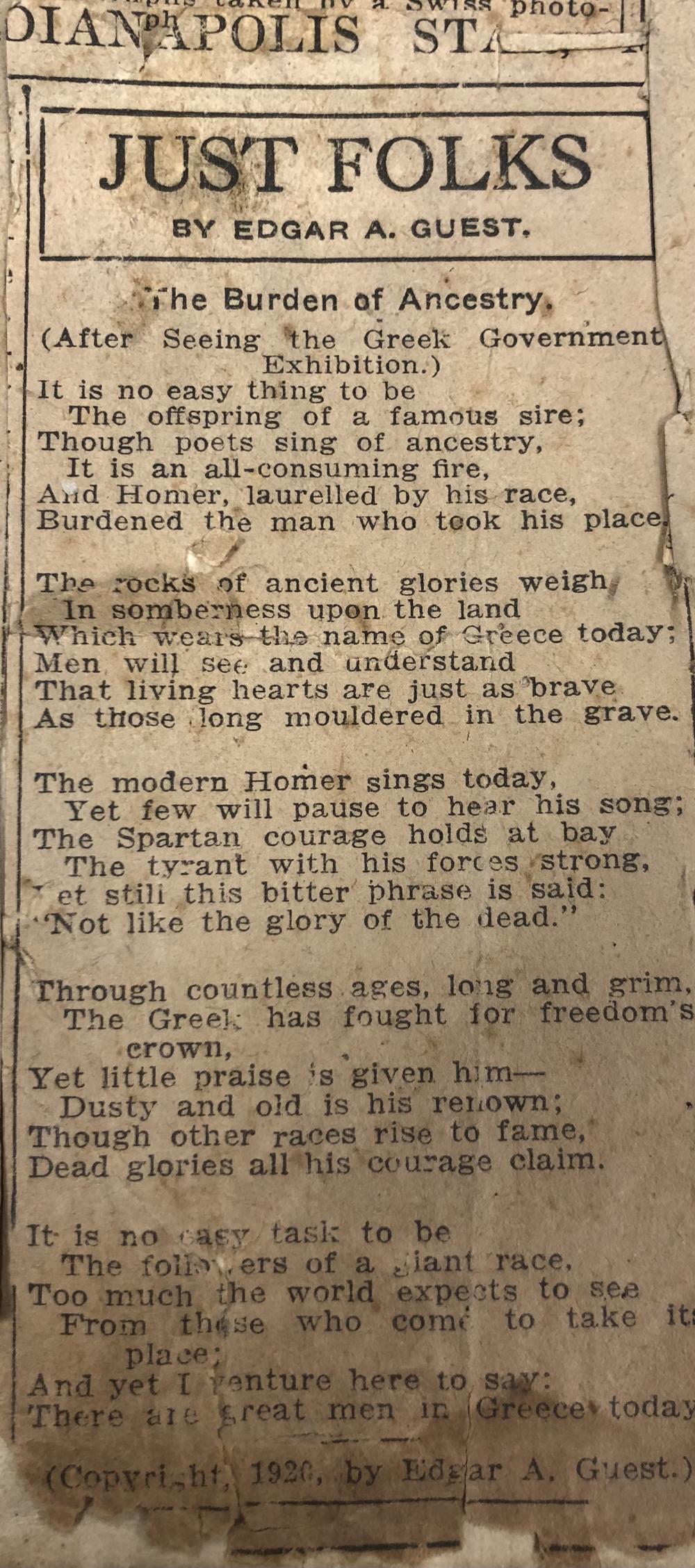 An old newspaper clipping of an article typed with black ink, which has been collaged onto a page with other clippings to create a book. The article, authored by Edgar A. Guest, has a header reading, "Just Folks." Underneath the article header, is the title, "The Burden of Ancestry." The article is small and has a decorative border that encompasses the article's texts. The newspaper clipping displays damage, mainly tears, and stains, along the edges. At the bottom, the last line of text is the copyright date reading, "(Copyright, 1920, by Edgar A. Guest)."