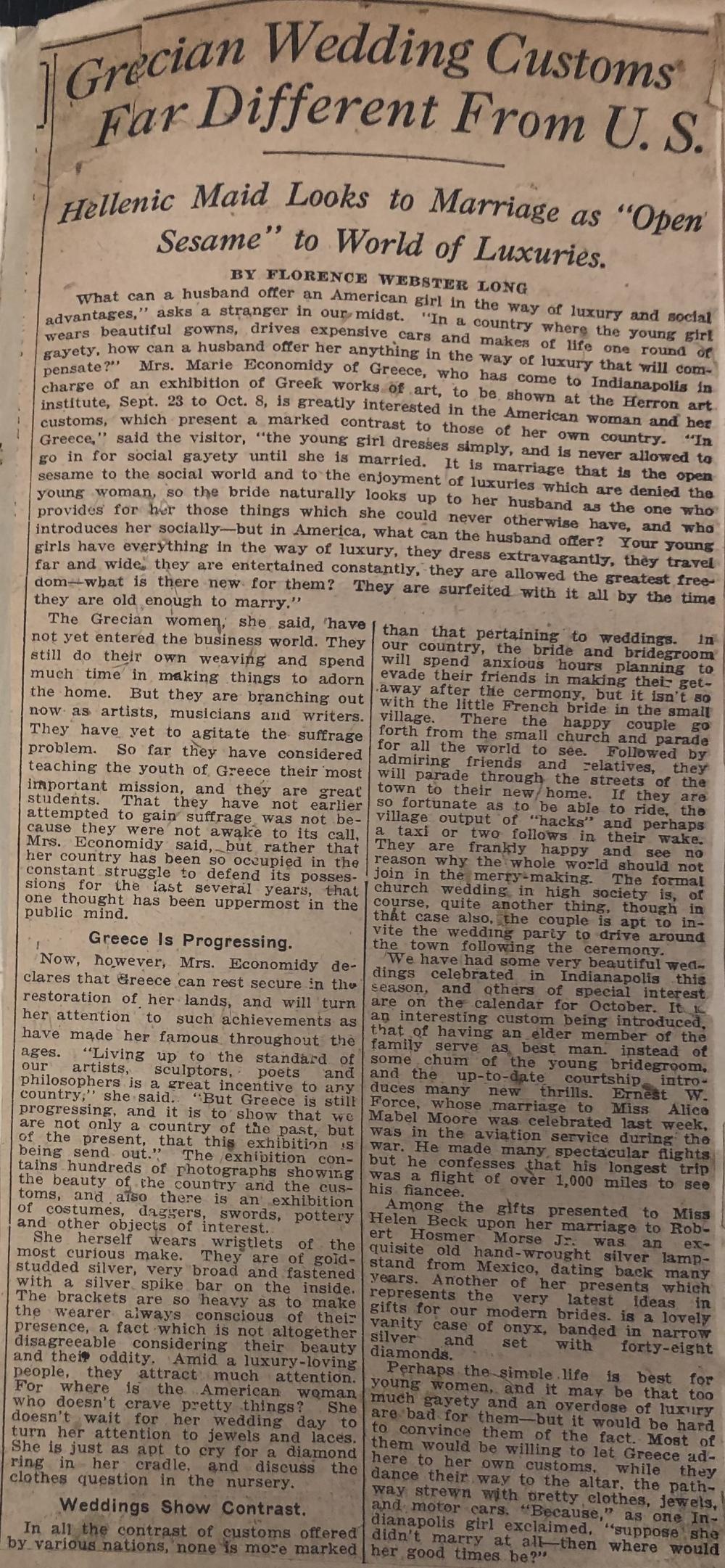 An old newspaper clipping of an article typed with black ink, which has been collaged onto a page with other clippings to create a book. The article, authored by Florence Webster Long, is titled "Grecian Weddings Customs Far Different From U.S." Underneath the title is an additional text that reads, "Hellenic Maid Looks to Marriage as "Open Sesame" to World of Luxuries." The article is broken into eight paragraphs and two categories titled, "Greece is Progressing" and "Weddings Shows Contracts."