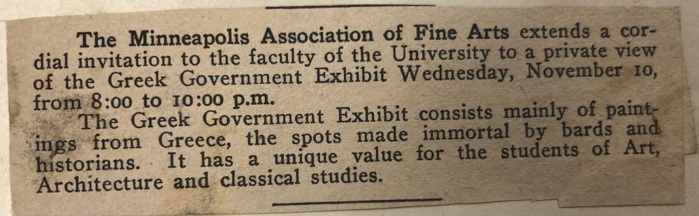 A old newspaper clipping features an article typed with black ink, which has been collaged onto a page with other clippings to create a book. The article is written in English and is titled "The Minneapolis Association of Fine Arts extends" are bolded. The article is presented in a horizontal layout and consists of two paragraphs.