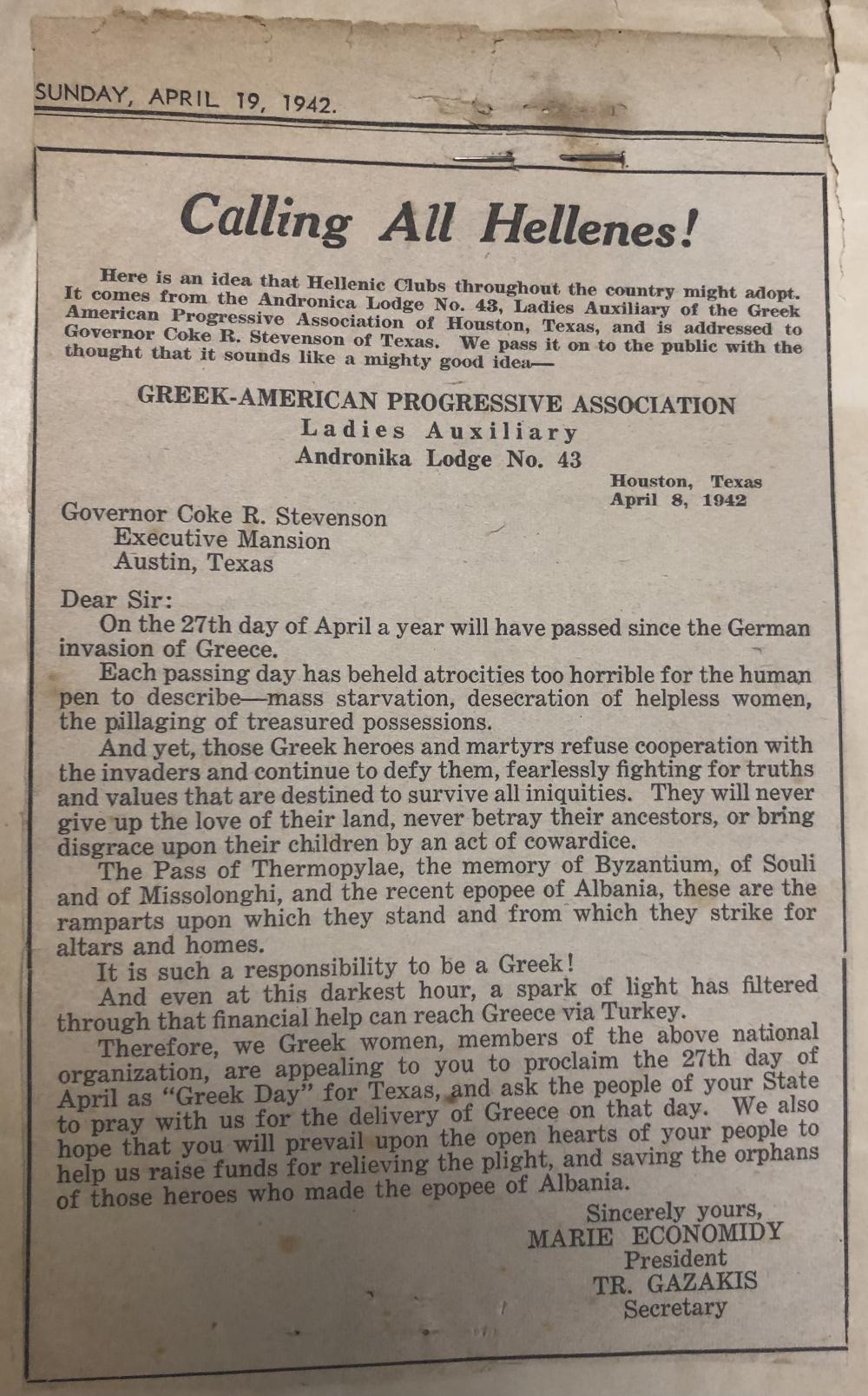 A newspaper clipping features an article typed with black ink, which has been collaged onto a page with other clippings to create a book. The article is written in English and is titled "Calling All Hellenes!" Underneath the title is an additional text that reads "Here is an idea that Hellenic Clubs throughout the country might adopt. It comes from the Andronica Lodge No. 43, Ladies Auxiliary of the Greek American Progressive Association of Houston, Texas, and is addressed to Governor Coke R. Stevenson of Texas. We pass it on to the public with the thought that it sounds like a mighty good idea-." At the top of the article is a date the text reads, "Sunday, April 19, 1942." The article is presented in a vertical layout and consists of six paragraphs.
