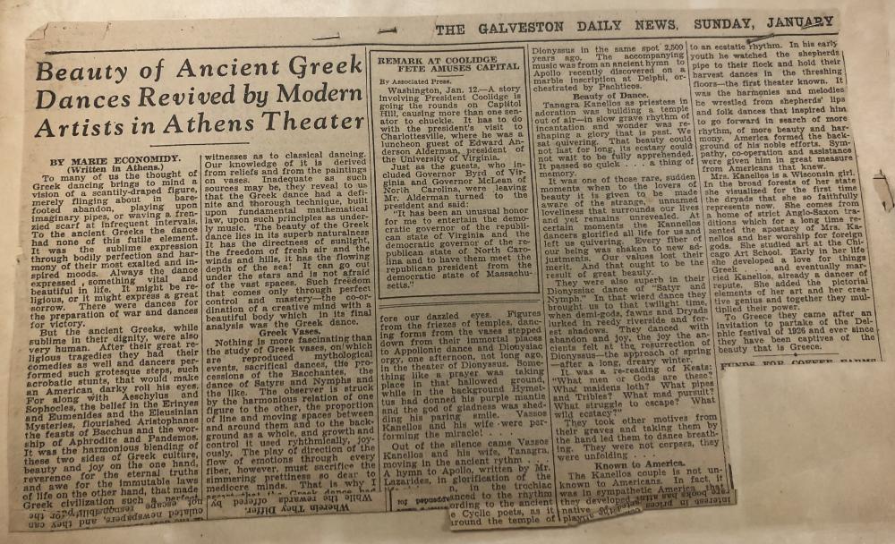 A newspaper page of an article typed with black ink; The article has been collaged onto a page with other clippings to create a book. At the top right-hand corner is the name of the newspaper company that printed the article, which reads, "The Galveston Daily News," with the date "Sunday, January" to the right. At the top left-side corner is the article title, which reads, "Beauty of Ancient Greek Dances Revived by Modern Artists in Athens Theater. Underneath the title is the author, reading as "Marie Economidy (written in Athens)." The article is large and composed of 14 paragraphs that have been broken into three categories, Greek Vases, Beauty of Dance, and Know to America. In the center of the page, in an enclosed lined box is a separate article. The title reads, "Remark at Coolidge Fete Amused Capital," written by "Associated Press." At the very bottom of the newspaper is folding damage, obstructing a portion of the text.