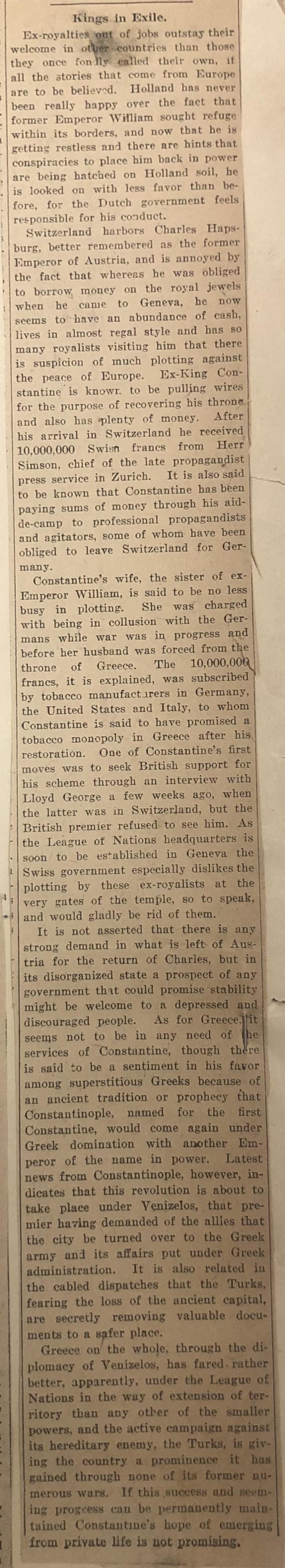 A newspaper clipping of an article typed with black ink and written in English. The article has been collaged onto a manila page with other clippings to create a book. The article is long, presented in a vertical layout, and consists of five paragraphs. At the top is the article title, which reads, "Kings in Exile." Below the title, the first sentence is a black smug. On the right-hand side, along the article's edge are tears.