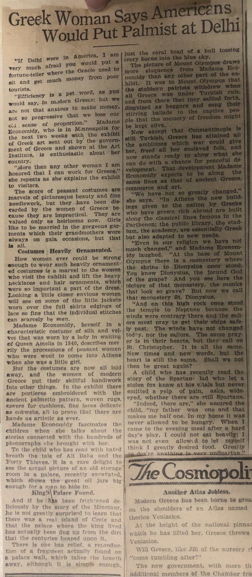 A newspaper clipping of an article typed with black ink and written in English. The article has been collaged onto a manila page with other clippings to create a book. The article is presented in a vertical layout, consisting of 17th paragraphs that are broken into two categories, "Costumes Heavily Ornamented and King's Palace Found." At the top is the article title, which reads, "Greek Woman Says Americans Would Put Palmist at Delhi." At the bottom, left-hand corner is a separate article, which reads "The Cosmopoli (the remaining portion of the title is cut off), "Another Atlas Jobless."
