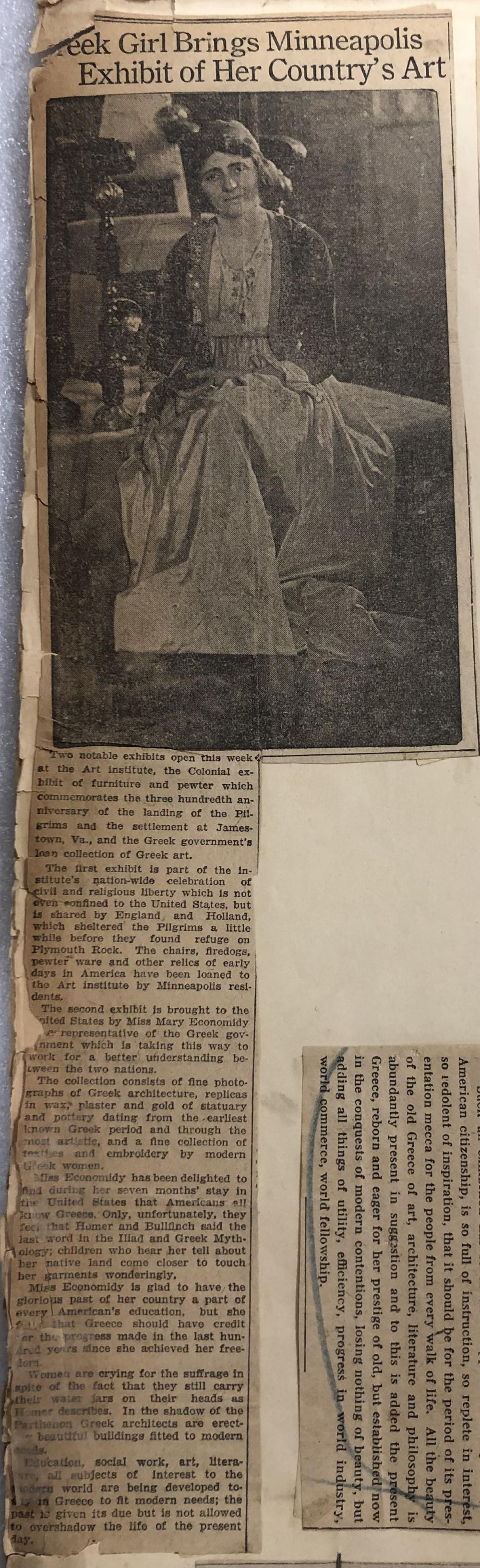 A newspaper clipping of an article typed with black ink and written in English. The article has been collaged onto a manila page with other clippings to create a book. Due to the tear in the top left-hand corner, a portion of the title has been damaged. The article titled reads as "eek Girl Brings Minneapolis Exhibit of Her Country's Art." Below the article title is a black and white photograph of an individual, assumedly Mrs. Maria Economidy, dressed in a Greek costume and seated on an assumed pedestal with a chair behind them. Underneath the image is the article's text, which is broken into eight paragraphs. Five of the paragraphs, stemming from the bottom to the center, have tape going across the edge and center. Along the left edges of the article are folding and tear damage. To the far right, bottom corner is a small article college onto the page.