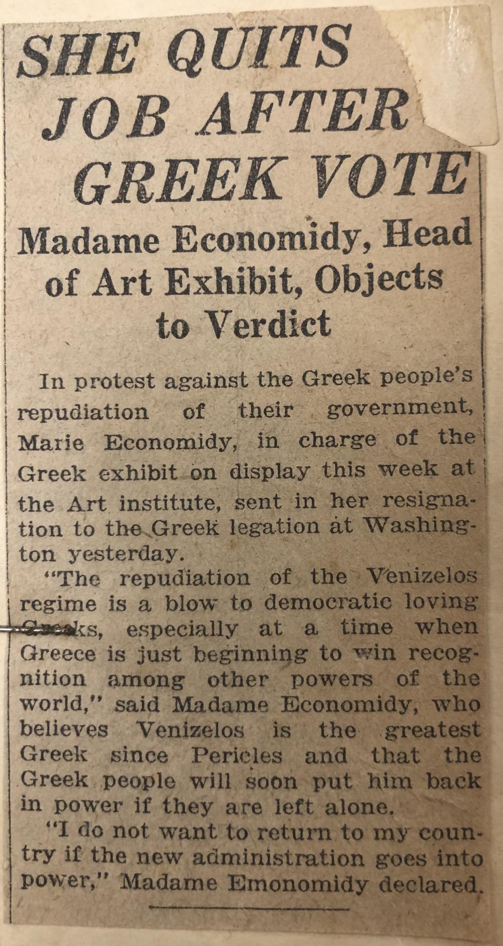 A newspaper clipping of an article typed with black ink and written in English. The article has been collaged onto a manila page with other clippings to create a book. At the top, located in the center, is the article's title, which reads "She Quits Job After Greek Vote." Under the title is an additional text that reads, "Madame Economidy, Head of Art Exhibit. Objects to Verdict." The article is small, consisting of two paragraphs, and has tape in the top right corner that is visible due to the tear damage near the article's title.
