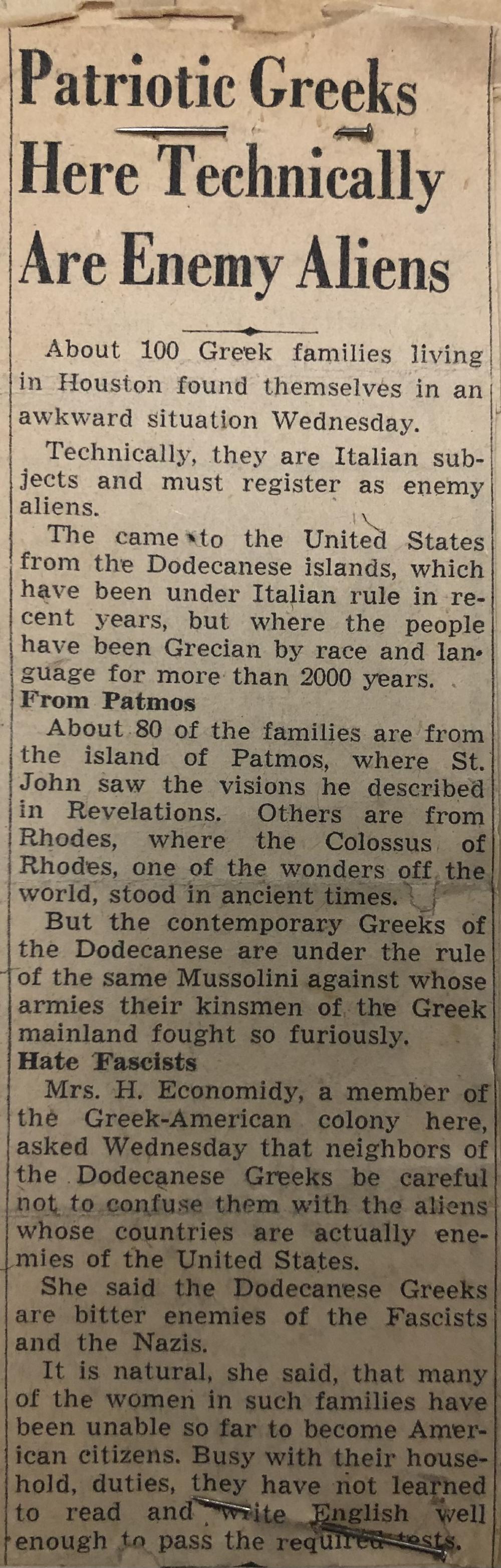 A newspaper clipping of an article typed with black ink and written in English. The article has been collaged onto a manila page with other clippings to create a book. The article consists of six paragraphs with two categories. The categories are at the beginning of the third paragraph and the top of the fifth paragraph, which read as "From Patmos" and "Hate Fascists." Seen at the top of the page is the article's title, which reads, "Patriotic Greeks Here Technically Are Enemy Aliens."