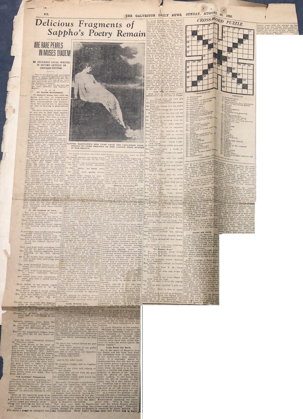 A newspaper page of an article typed with black ink and written in English is collaged onto a manila page and other clippings to create a book. The article, written by Marie Economidy, is titled "Delicious Fragments of Sappho's Poetry Remain," seen at the top of the article. Above the article's title is the newspaper publisher and date, which reads, "The Galveston Daily News, Sunday, August 22, 1920." The article is large, consisting of a black and white photographic image of an individual lounging on a rock, dressed in ancient Greek attire, and a crossword puzzle on the far left-hand side. Underneath the photograph is additional text that reads, "Sappho meditating her leap from the Leucadian Rock, hoping to cure herself of the passion that burned in her breast."