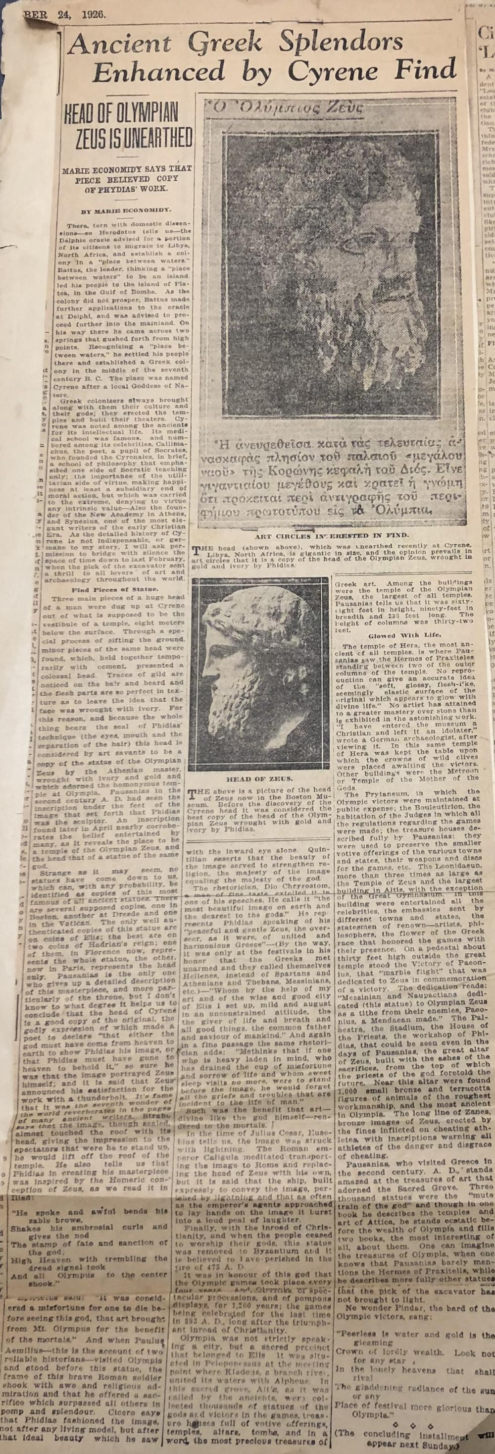A newspaper page of an article typed with black ink and written in English is collaged onto a manila page and other clippings to create a book. The article, written by Marie Economidy, is titled "Ancient Greek Splendors Enhanced by Cryene Find." Additional text underneath the article title reads, "Head of Olympian Zeus is Unearthed. "The article contains two black-and-white photographs of the bust of Zeus located on the left side of the clipping. The image seen below the article's titles has text placed below written in Greek. In the upper left corner of the article is a date that displays damages due to trimming. The date reads, "ber (probably September) 24, 1926."
