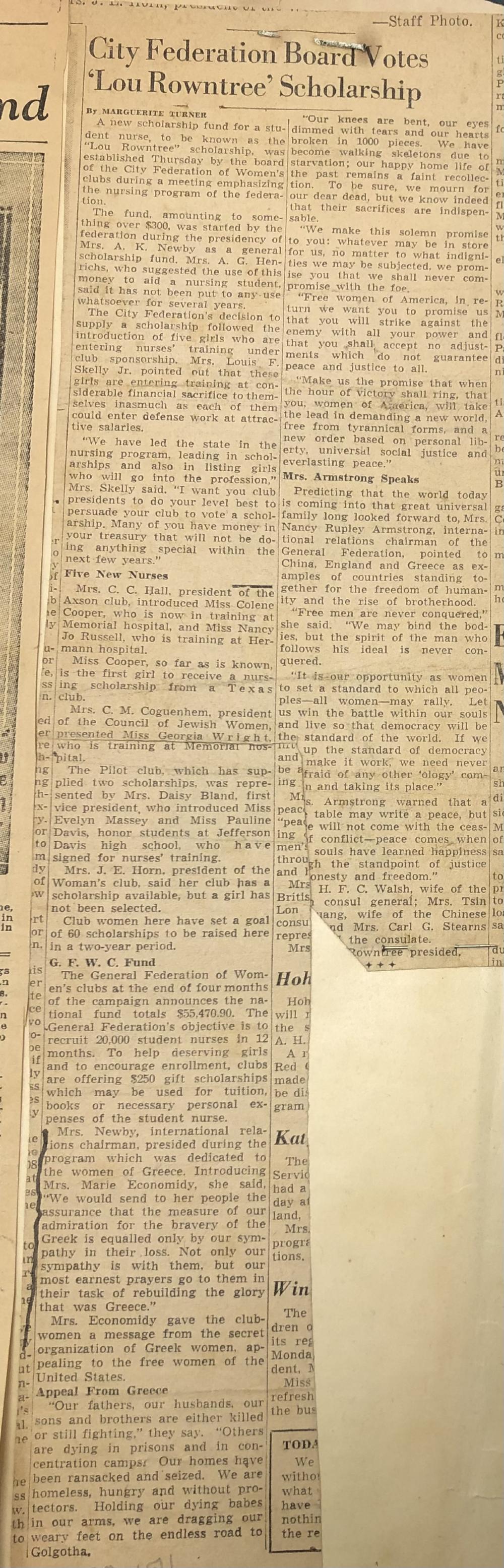 A newspaper page of an article typed with black ink and written in English is collaged onto a manila page and other clippings to create a book. The article, written by Marguerite Turner, is titled "City Federation Board Votes 'Lou Rowntree' Scholarship." The article is rather long and consists of 22 paragraphs, which are placed into four sections: "Five New Nurses," "G.F.W.C Funds," "Appeal from Greece," and "Mrs. Armstrong Speaks." Near the bottom of the article, left-hand-side, under section G.F.W.C Funds, is a black, hand-drawn line along the left edge. The line directs the attention to Mrs. Marie Economidy's statement within the section.