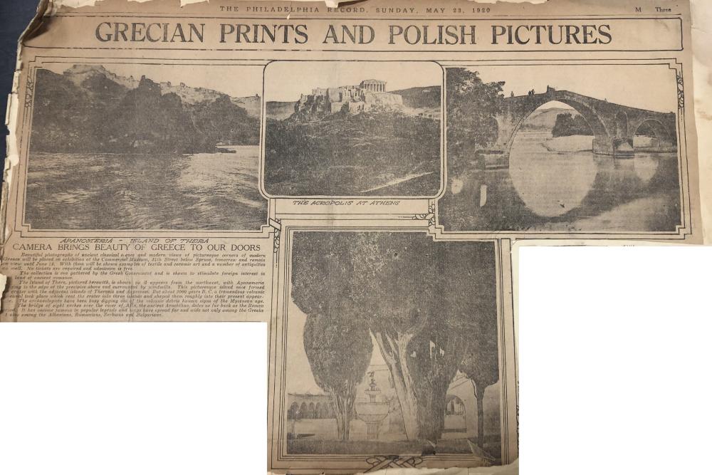 A newspaper page of an article typed with black ink and written in English is collaged onto a manila page and other clippings to create a book. At the top of the article, printed in black text, is the newspaper publication and article's date, which reads as "The Philadelphia Record, Sunday, May 23, 1920." Located underneath the publisher's name and date is the article title, which reads, "Grecian Prints and Polish Pictures." The newspaper clipping contains four black-and-white photographs of landscapes and architectural buildings with additional text below each image. Near the bottom of the article, beneath the pictures, are the words "Camera Brings Beauty of Greece to our Doors."