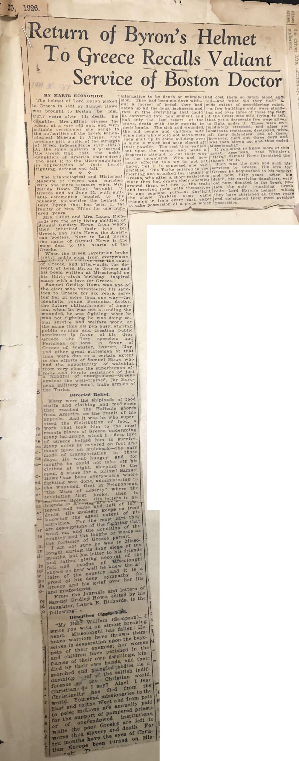 A newspaper clipping features an article typed in black ink and written in English that is collaged onto a manila page along with other clippings to create a book. At the top of the article, centered in the middle, is the article's title: "Return of Byron's Helmet To Greece Recalls Valiant Service of Boston Doctor." Above the article title, left-hand corner is the article date, "25, 1926." The article, written by Marie Economidy, is formatted in a P-like shape and consists of eleven paragraphs, which are divided into two sections: "Directed Relief" and "Describes (the rest of the section title is obscured due to a silver pin that holds the article in place).