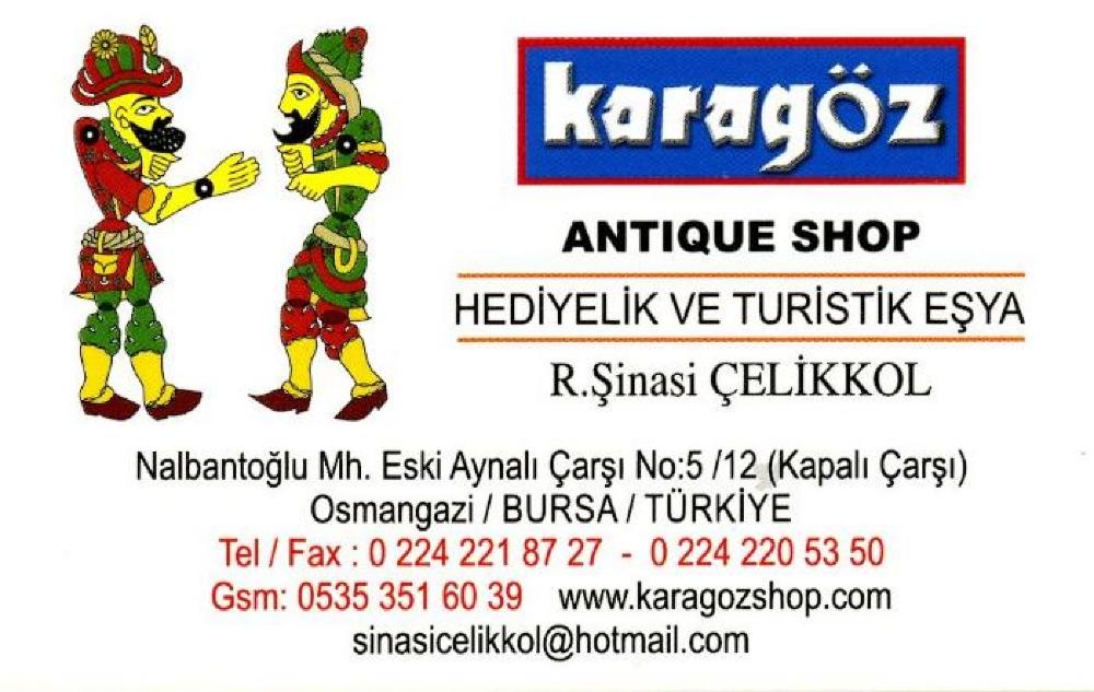 White business card with two bearded characters on the left side and karagöz written on the right side in white letters with a blue background with a red border.