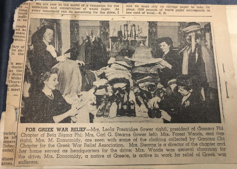 A newspaper clipping features an article typed in black ink and written in English that is collaged onto a manila page along with other clippings to create a book. The majority of the article is composed of a singular black-and-white photograph located in the center of the clipping. The photograph showcases four individuals, each with an article of clothing in their hands, in a room cluttered with clothing. Below the image is a text that reads: "For Greek War Relief- Mrs. Leola Prestridge (lower right), president of Gamma Phi Chapter of Beta Sigma Phi; Mrs. Carl G. Stearns (lower left); Mrs. Forest Woods, and (top right), Mrs. M. Economidys […]."