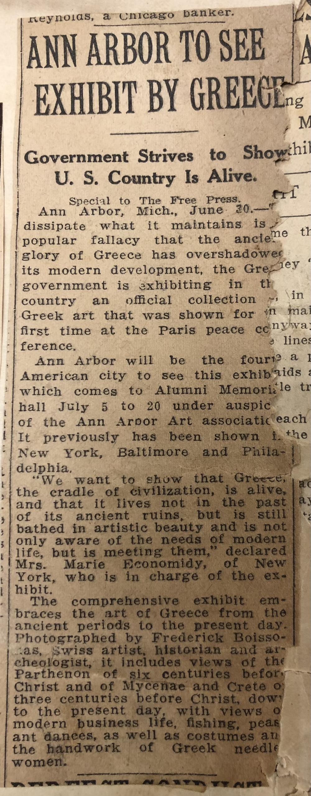 A newspaper article has been collaged onto a manila page alongside other clippings to create a book. The article is written in English and printed in black ink. In the top center of the article is the article's title printed in bold black lettering. The title reads, "Ann Arbor To See Exhibit By Greece." Under the article's title is additional text which reads "Government Strives to Show U.S. Country Is Alive." The article is brief, consisting of four paragraphs, and has tearing damage along the right edge.