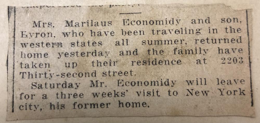 A newspaper article has been collaged onto a manila page alongside other clippings to create a book. The article is written in English and printed in black ink. The article is short, comprised of two paragraphs, and features a decorative black line border along the sides of the article. The paper is discolored, displaying dark spots due to age, and part of the text is discolored and fading. The newspaper clipping reads, "Mrs. Marilaus Economidy and son, Eyron, who have been traveling in the western states all summer, returned home yesterday and the family have taken up their residence at 2203 Thrity-second street. Saturday Mr. Economidy will leave for a three weeks' visit to New York city, his former home."