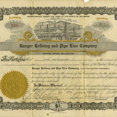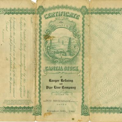 Stock certificate from the Ranger Refining and Pipe Line Company.