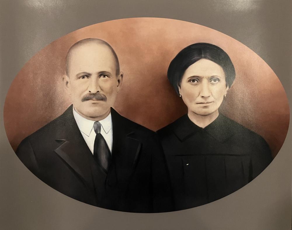 The original hand-painted antique portrait of this couple began as a lightly printed black and white photograph that was painted over by an artist. The man is Panagiotis (Paiko) Anagnostopoulos (1863-1945) and Olga Anagnostopoulos (Kakouri) (1869-1954). The artist painted Paiko in great detail, but Olga was most likely painted by the assistant.