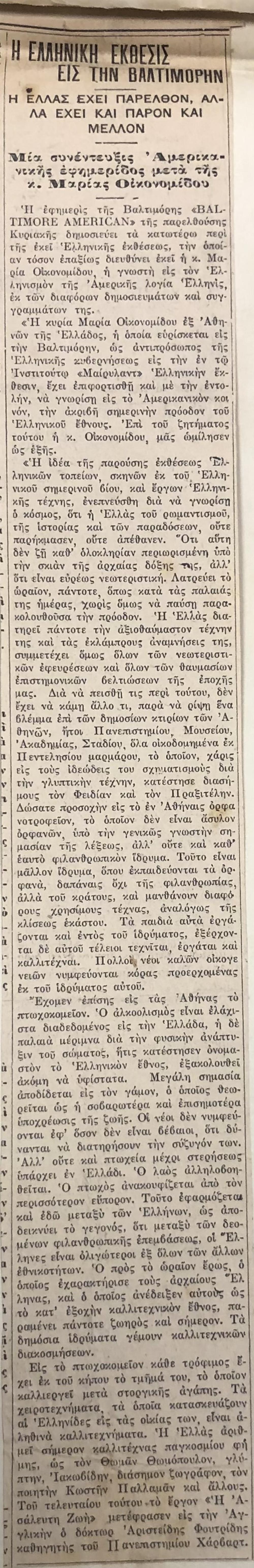 A newspaper article has been collaged onto a manila page alongside other clippings to create a book. The article is written in Greek and printed in black ink. The text is short, consisting of five paragraphs. At the top the headline is prominently displayed in bold black text and translates to, "The Greek Exhibition in Baltimore." Underneith the headline is the article subline reading as "Greece has a past, but it also has a present and future," and "An American newspaper interview with Ms. Maria Okonomidou."