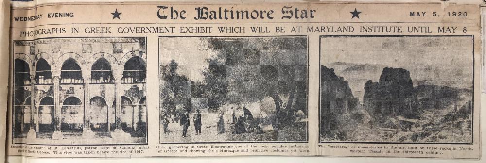 A newspaper page of an article typed with black ink and written in English is collaged onto a manila page and other clippings to create a book. At the top of the article, printed in black text, is the newspaper publication and article's date, which reads as "Wednesday Evening, The Baltimore Star, May 5, 1920." Located underneath the publisher's name and date is the article title, which reads, "Photographs in Greek Government Exhibit which will be at Maryland Institute until May 8." The newspaper clipping contains three black-and-white photographs of landscapes and architectural buildings with additional text below each image.