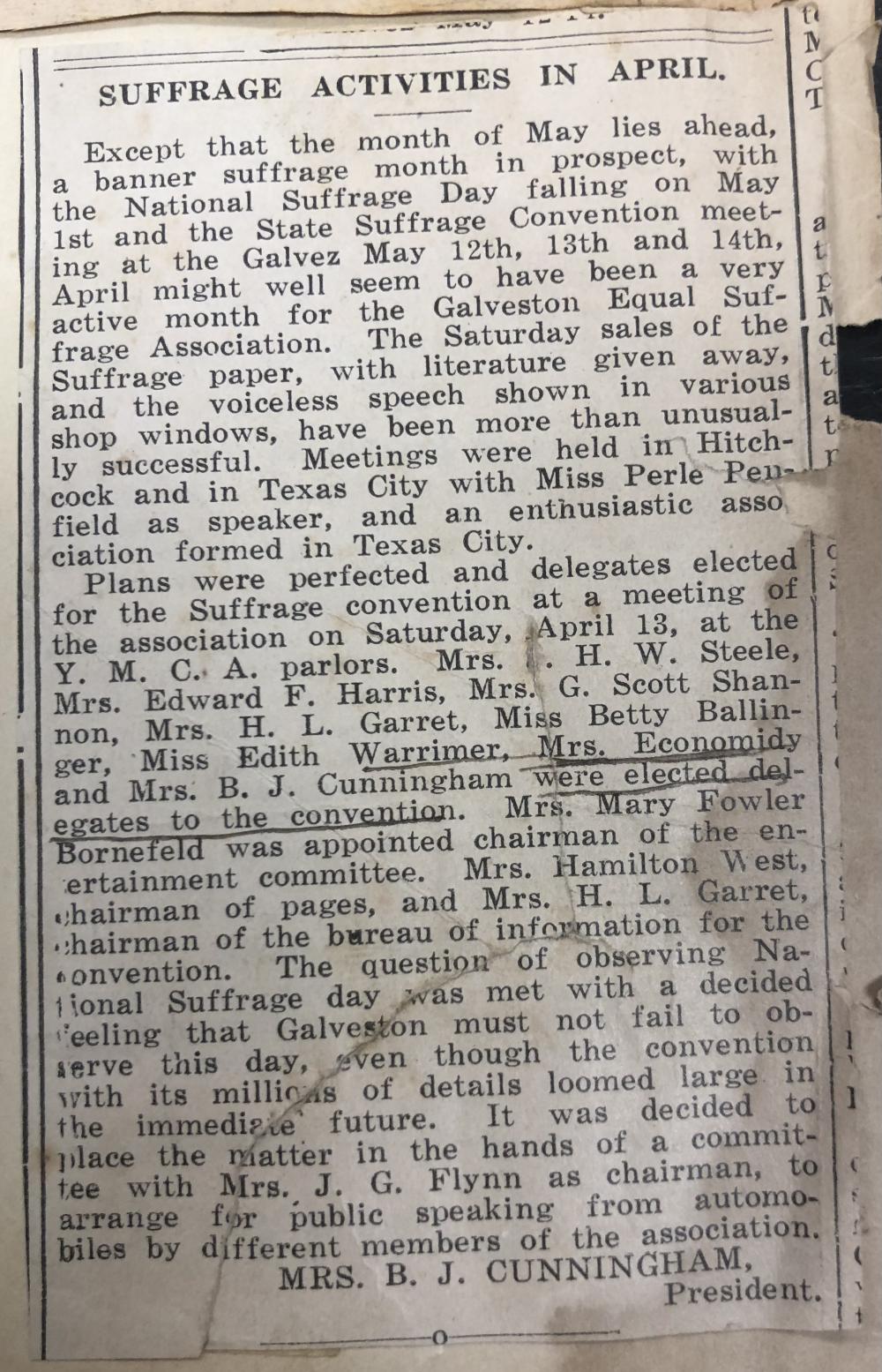 A newspaper article has been collaged onto a manila page alongside other clippings to create a book. The article is written in English and printed in black ink. The text is short, consisting of two paragraphs. At the top, located in the center of the article is the article's header, which reads as "Suffrage Activities in April." The article displays tearing along with right edge and at the end of the article. Towards the middle of the newspaper clipping pencil markings that underlined the words, "Warrimer, Mrs. Economidy," "were elected delegates to the convention."