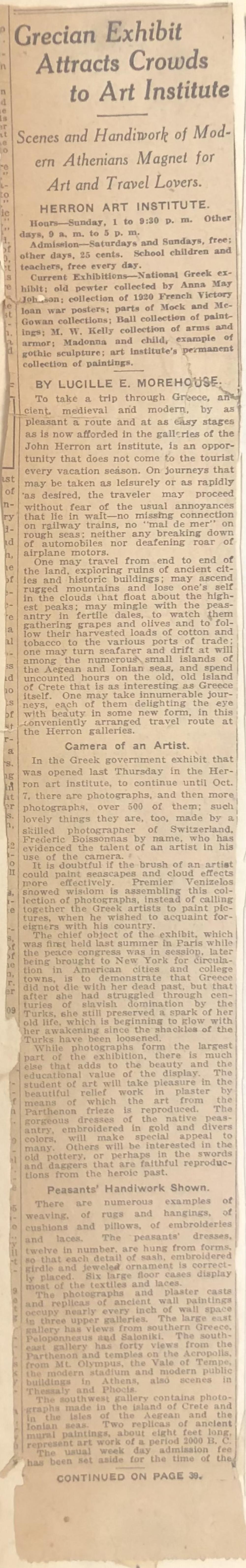 A newspaper article has been collaged onto a manila page alongside other clippings to create a book. The article, written in English and printed in black ink, is authored by Lucille E. Morehouse and consists of eleven paragraphs that are broken into two sections, "Camera of an Artist" and "Peasants' Handiwork Shown." At the top of the page, centered, is the article's header, which reads, "Grecian Exhibit Attracts Crowds to Art Institute." At the bottom of the newspaper, last line, reads "Continued on Page 39." The entire newspaper article is framed by a thin black-lined border, however a portion of the border is damaged due to tearing along the edges.