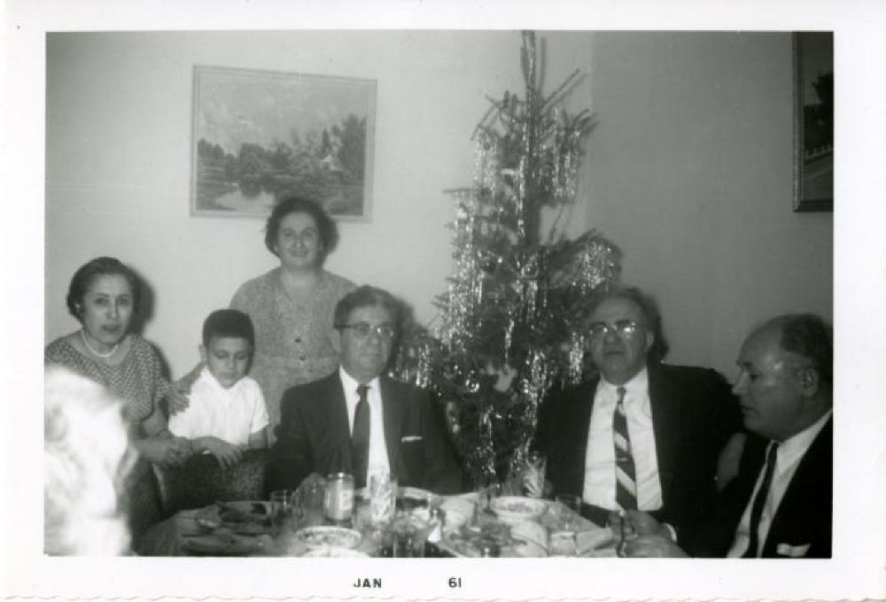 From left to right: Unknown (can only see the back of their head), Georgia Psimoulis, Sam Psimoulis, Unknown, Gus Psimoulis, George Kezios (Sam's uncle), Unknown. The photograph was taken in January 1961 in a home in the Lincoln Park neighborhood in Chicago, Illinois.