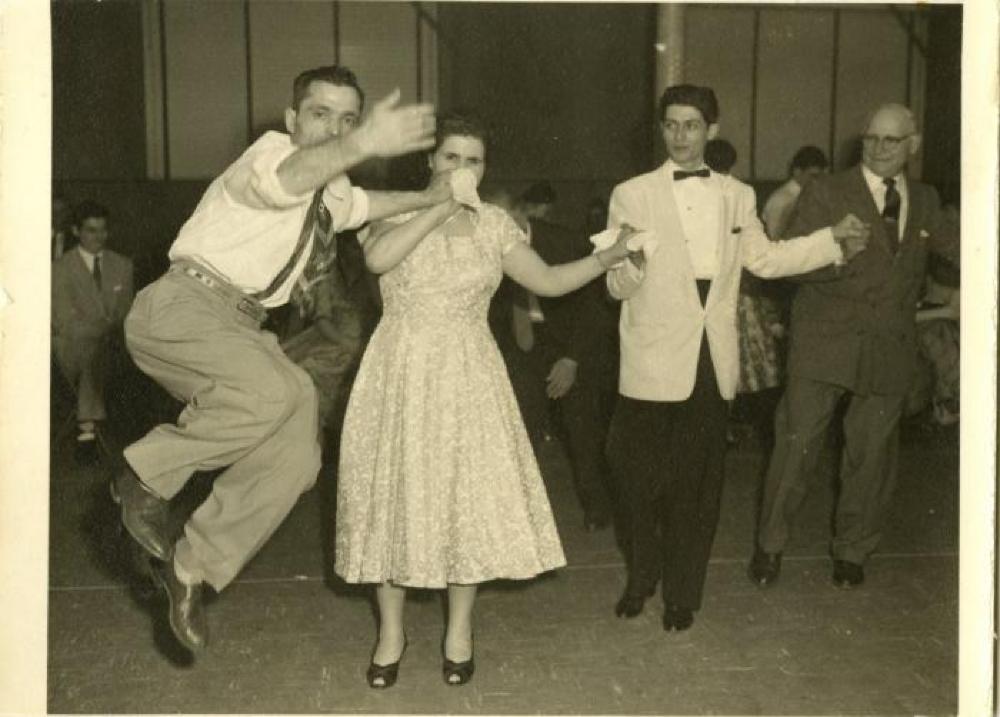 A digitized black and white photograph of people dancing.