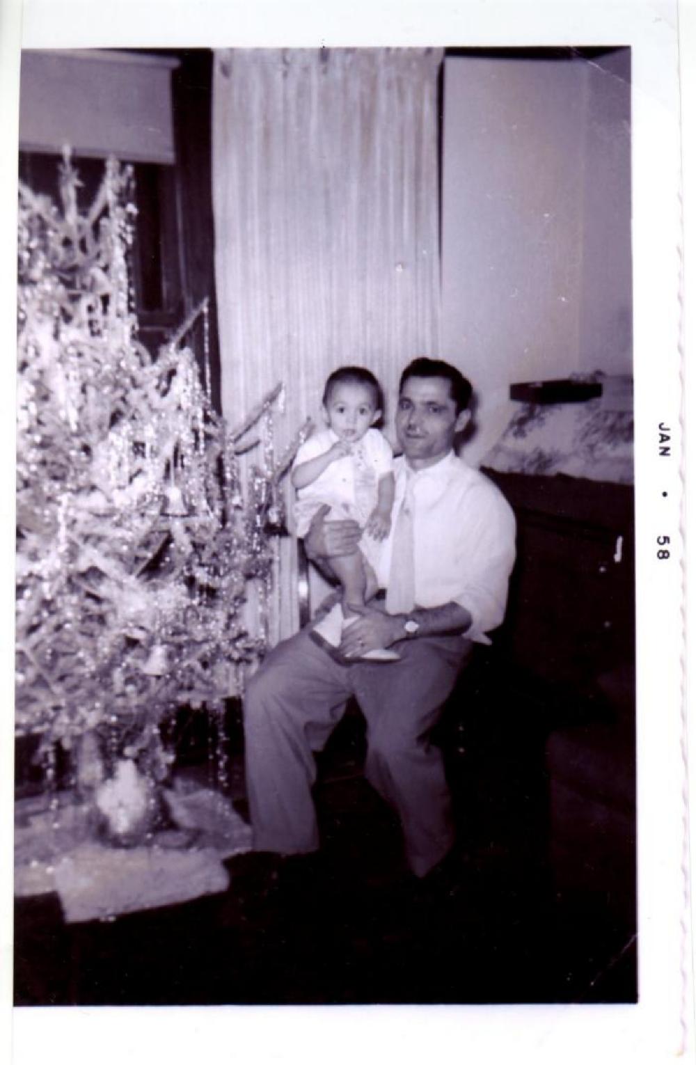 John Ballis sitting next to a Christmas tree while holding Mary Ballis while celebrating Christmas in 1958.
