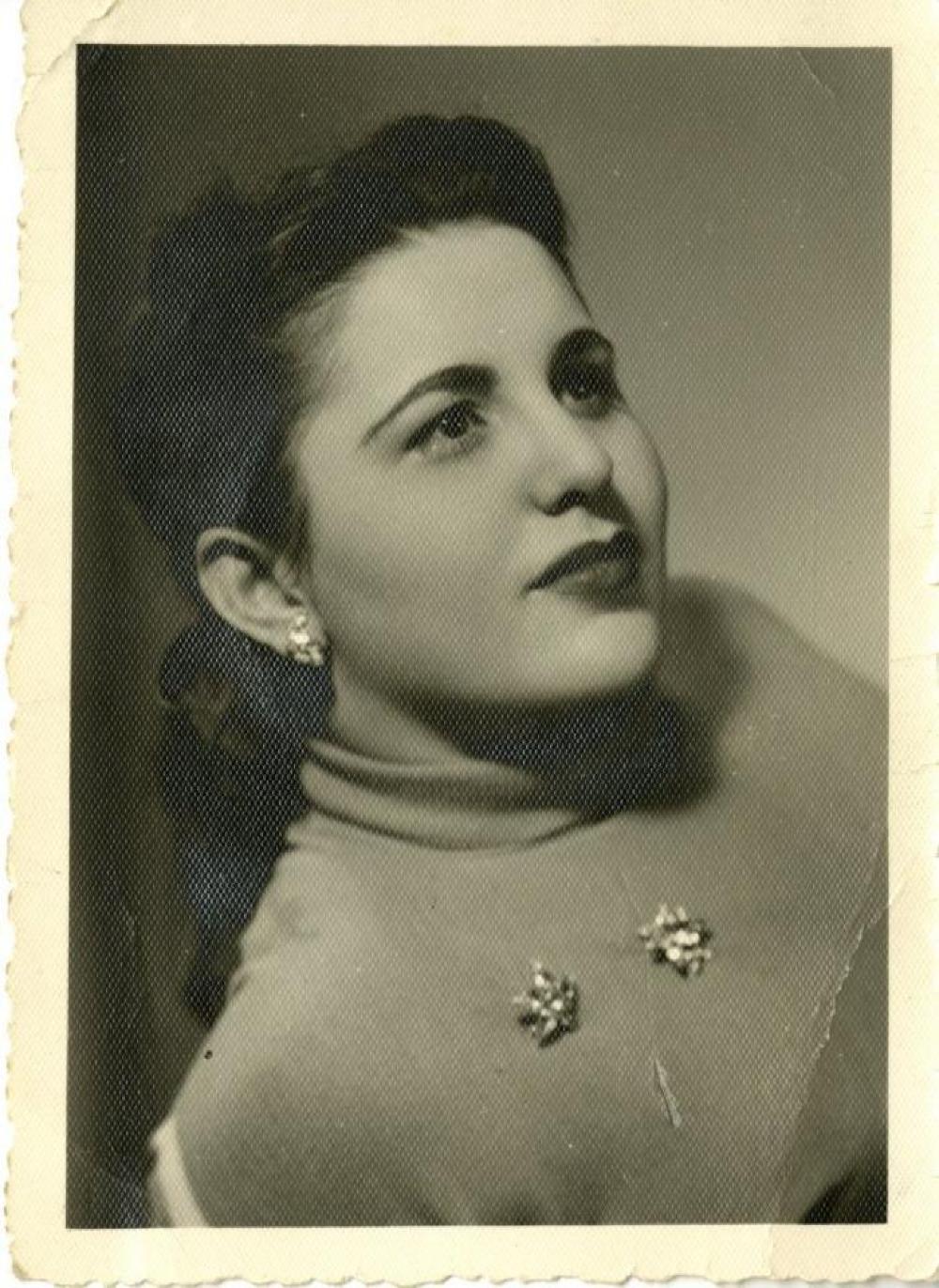 A digitized black and white photograph showing a headshot of a woman with long, dark hair and two brooches on her top.