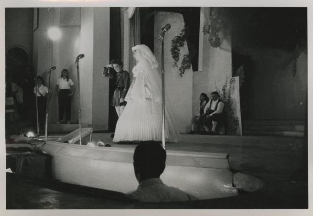 A black and white photograph depicting six people surrounding an indoor stage facing the two people on the stage. The person on stage to the right is wearing a white dress with a veil, while the other person on stage appears to be wearing a costume.
