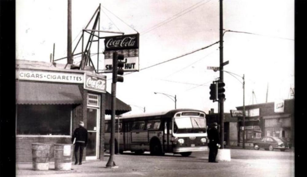 The photograph shows the corner of 442 E. 115th Street in Chicago, Illinois. The building on the left is the donor's uncle Pete's restaurant in the 1960s.