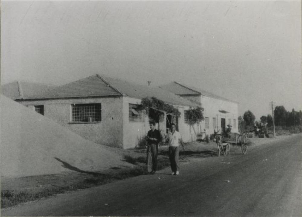 From donor: Near Etolikon, about 11 km from Messo-longhi on the road to Agrinion. The picture shows a rice mill by the high way, close to transportation. The pile on the left is made up of rice shells. Walking up to the camera are my guide Kokkinides and chauffer. Note the man with the push car. He sells EVGA ice cream made in Athens, which is shipped by refrigerator tracks to all parts of Greece. This is a post-war development.