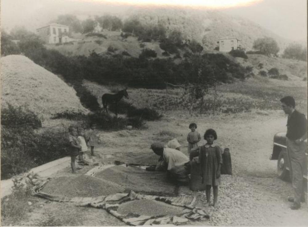 From donor: Village Botamoula about 30 km from Agrionon on the road to Karpenision. The picture shows a peasant family after threshing, filling the sacks with wheat. Note the respect displayed by the children watching their parents work. Husband and wife at same job. The wheat is on home woven spreads. The donkey next to the pile of straw seems to be aware that I was taking his picture. The little girl in the foreground has a cross, which shows the piety of the family. She is neatly dressed as are the rest of the children. This picture shows the noecocyrosyni of the Greek family, an important attribute in the economy of Greece. The woman hid deliberately behind her husband when I was taking the picture. Typical modesty and reserve of the Greek peasant woman.