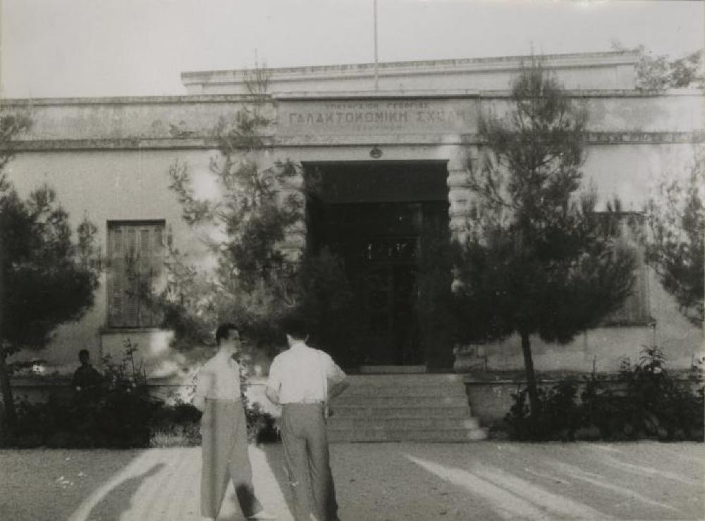 A black and white photograph depicting three people standing in front of a building. The building has trees in front of it and a sign with Greek writing. The sign reads: ΓΑΛΑΚΤΟΚΟΜΙΚΗ ΣΧΟΑΗ.