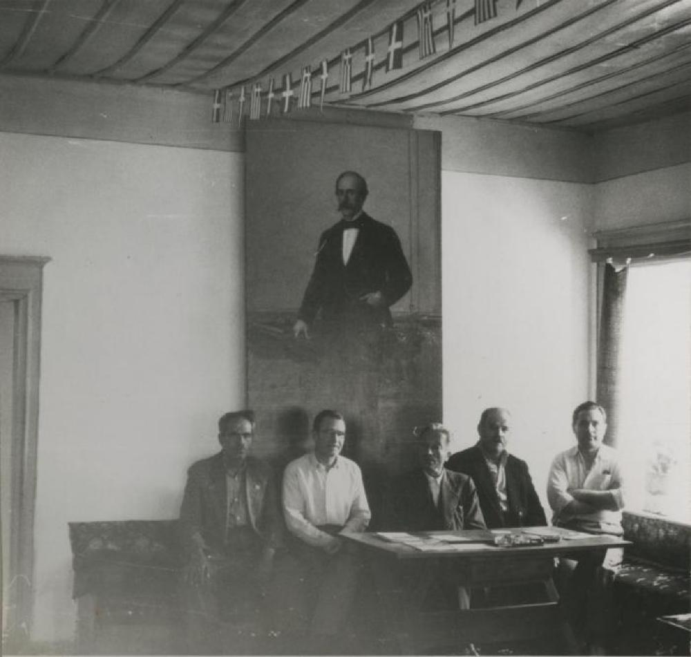 From donor: Metsovo. The Municipal House. In the middle is the Mayor Stergios Terzakis. The others from the left are Alexandros Koutsomanis (oikodespotis), N. Fanis (General Secretary of the Municipal Council), and Evagelos Pichas (Special Secretary). The portrait on the wall is that of Tositas. The whole village lives with his memory and takes pride in his wealth. Note here the flags hanging from the ceiling.