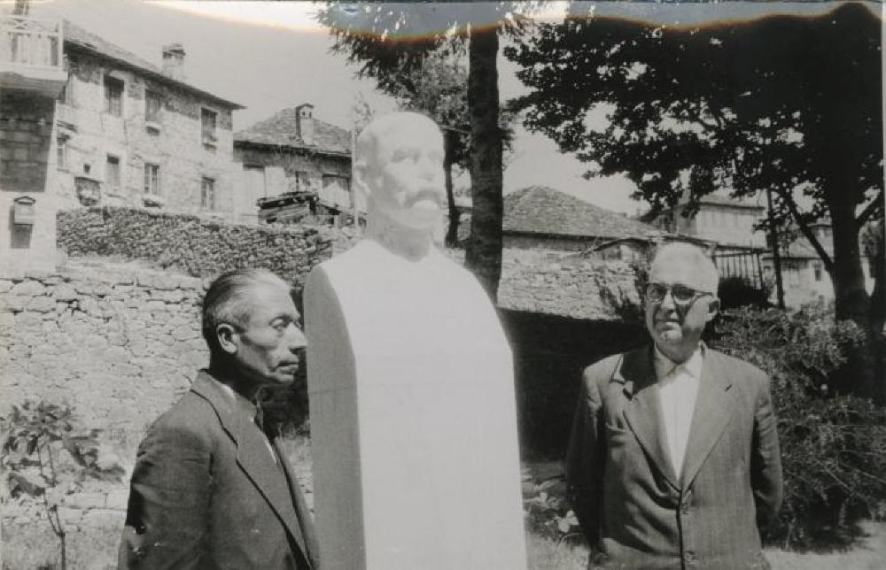 From donor: Metsovo. Shows the Tositsas bust. Standing on the left is the Mayor of the village Stergios Terjalis. On the left is the teacher Stergios Pantosis.