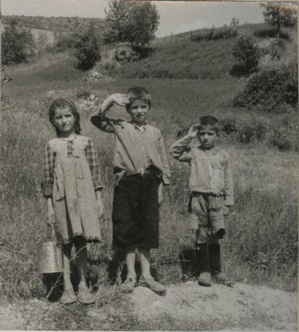 From donor: Near the village Korydalos, about 2-3 miles from Nea Koutsoufllani, on the Jannina-Kalambaka road. Three village children, most well-bred and alert in their rags: Vagios on the right, Charalambus in the middle, Chrysoula on the left. All three from the village Korydalos.