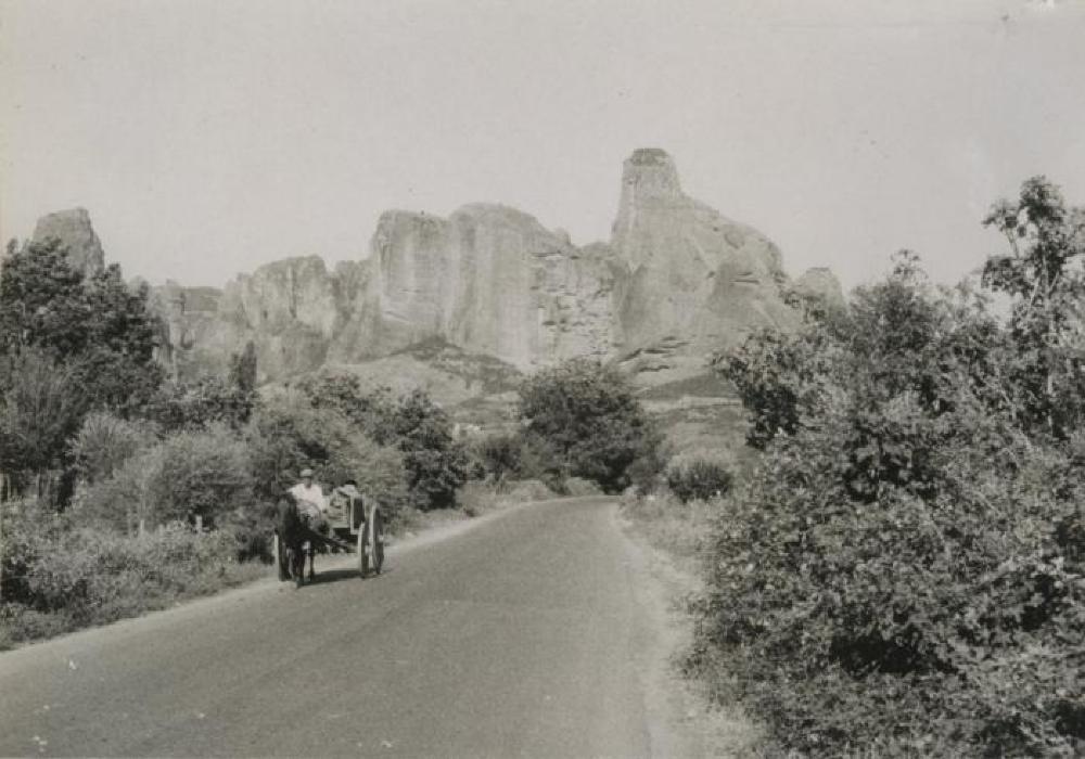 A black and white photograph depicting a person riding in what appears to be a cart pulled by a horse on a rural road. The road is flanked by trees on either side. In the background is a large rock formation.