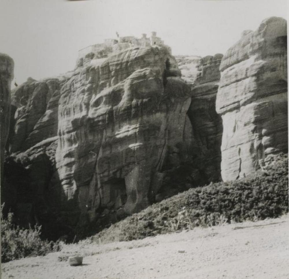 A black and white photograph depicting multiple buildings sitting on top of a large rock structure. At the base of the rock structure is vegetation covered ground.