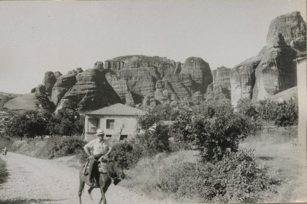 A black and white photograph depicting two people on a rural road. One person is riding a horse (?) in the foreground. In the background are two buildings surrounded by vegetation in front of a large rock structure.